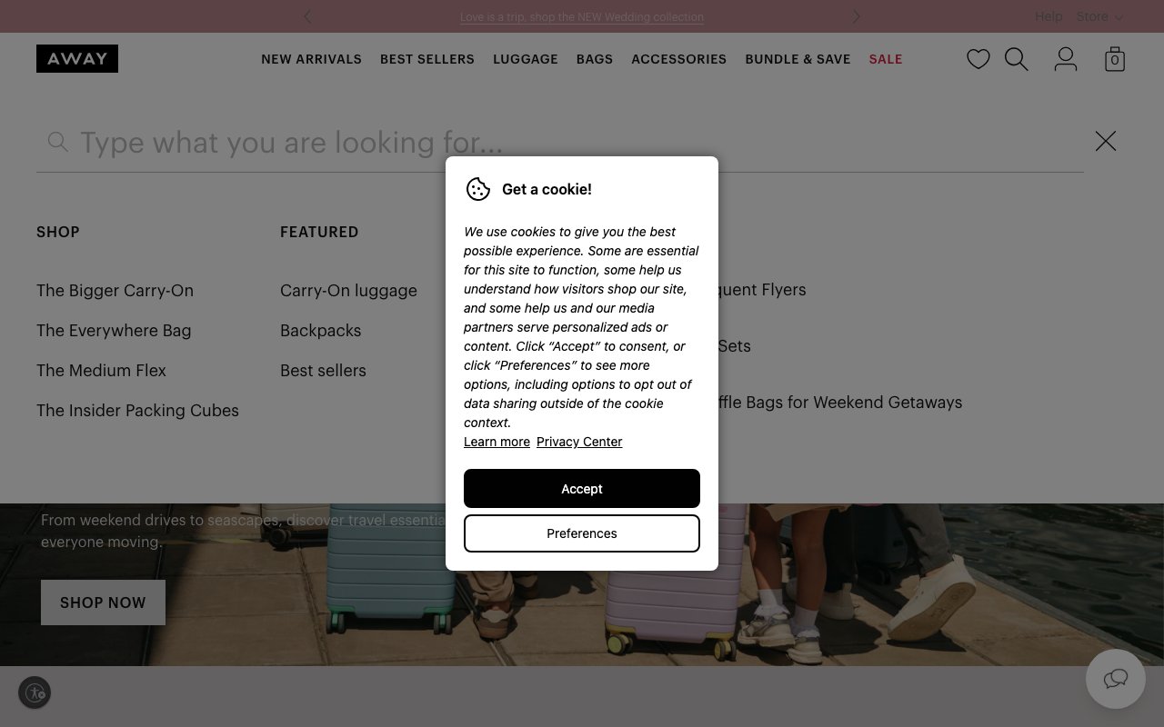 Lifestyle-focused travel imagery that sells the experience of owning Away luggage.