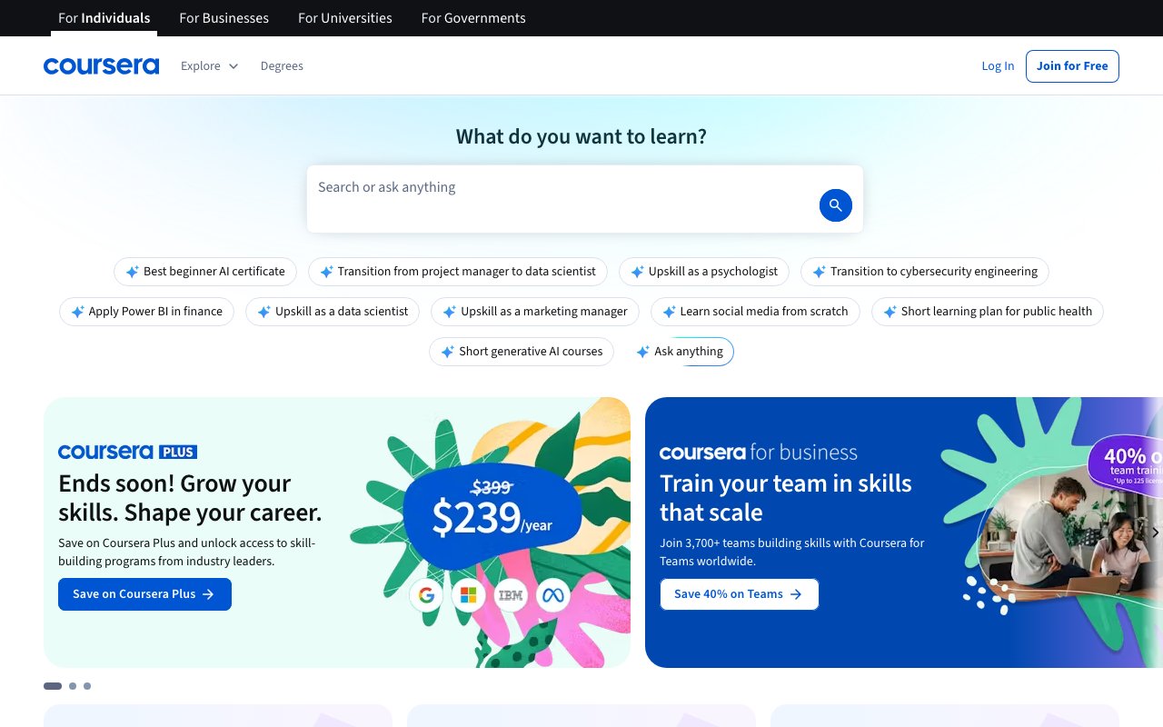 Coursera targets skill-specific searches with course landing pages featuring completion rates and reviews.