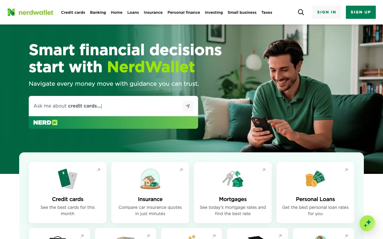 NerdWallet captures high-intent financial comparison searches with educational landing pages.