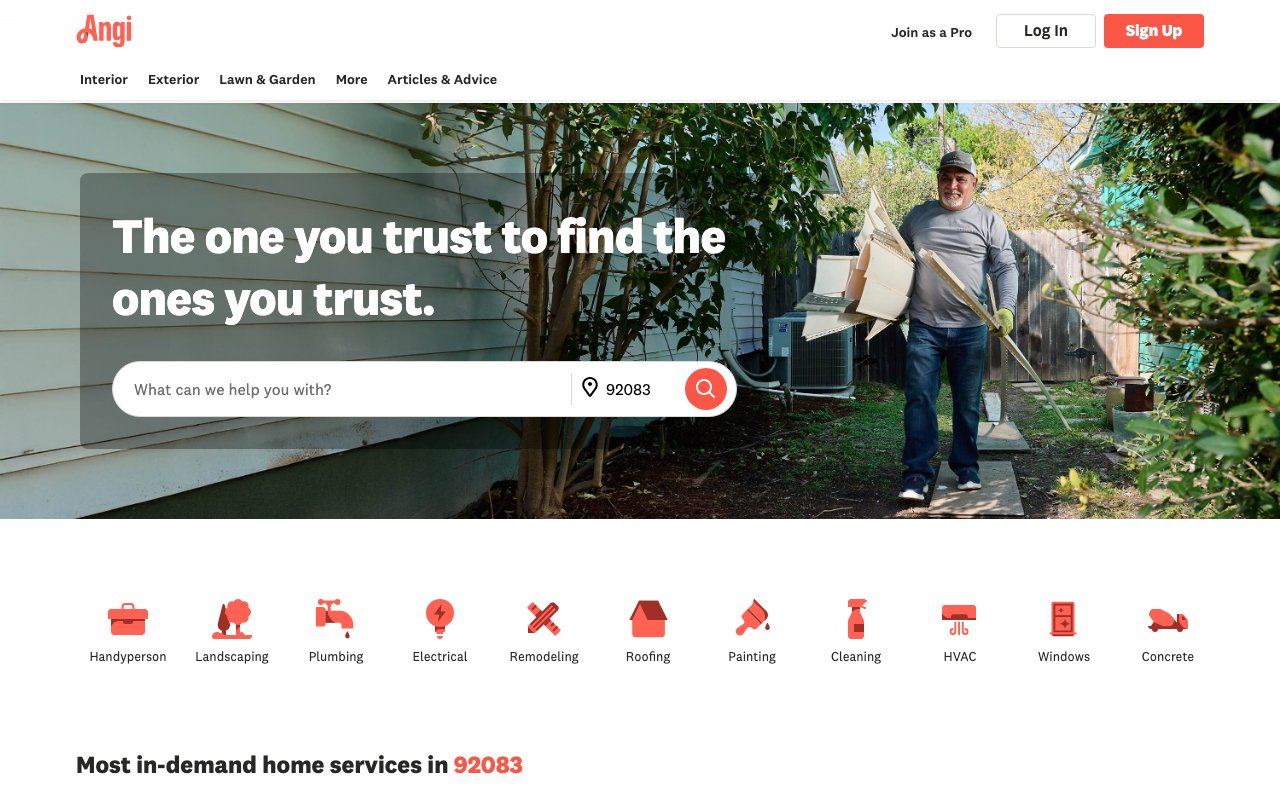 Angi captures home improvement searches with local pro matching and instant quote CTAs.